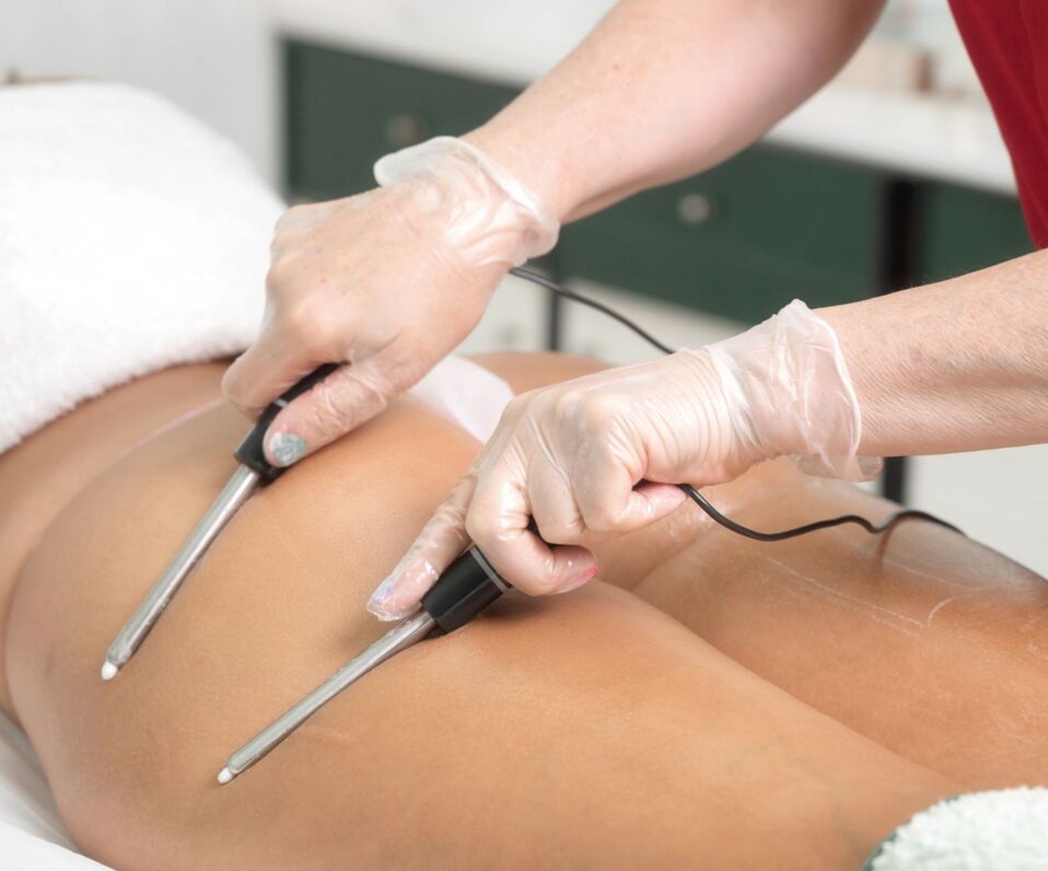 The treatment involves the analgesic effect of alternating currents applied locally in the form of two pairs of electrodes (used in pain syndromes).